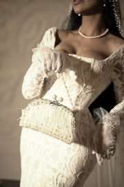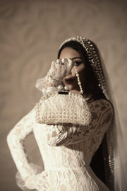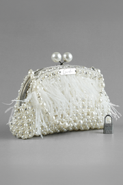 The “Vows” bridal bag symbolizes a timeless commitment and enduring love, blending romantic elegance with celestial beauty and natural grace. Handcrafted from ethereal feathers, lustrous pearls, and sparkling diamonds, this bag embodies the celestial romance of starlit vows under the night sky. Its design captures the delicate balance between nature’s beauty and bridal glamour, showcasing intricate feather motifs that dance like celestial bodies, accentuated by clusters of pearls representing purity and grace. Diamond embellishments add a touch of luxury and sophistication, elevating the bag to a symbol of eternal love and celestial enchantment, perfect for a bride’s special day.