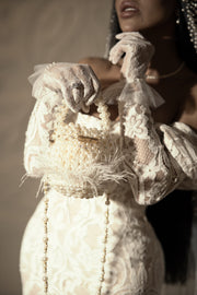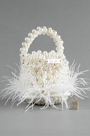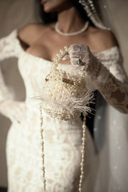 The āEvermoreā bridal bag is a timeless masterpiece that combines the elegance of vintage eras with opulent Art Deco and Victorian charm. Handcrafted from a mesmerizing array of various shapes of pearls, sparkling diamonds, and ethereal feathers, this bag embodies the epitome of vintage opulence and Hollywood glamour. Drawing inspiration from the Art Deco era, the bag features geometric patterns and cascading strands of round pearls and dazzling diamonds, reminiscent of lavish 1920s jewelry. Intricate lace-like designs made from delicate pearl clusters evoke the romance of the Victorian era, while feather accents in a symmetrical arrangement add a whimsical touch. The design also pays homage to old Hollywood glamour with starburst and sunburst motifs created from round pearls and diamonds, exuding the iconic elegance of vintage Hollywood fashion. The āEvermoreā bag is a true work of art, capturing the essence of timeless luxury and sophistication, making it the perfect accessory for a brideās special day.